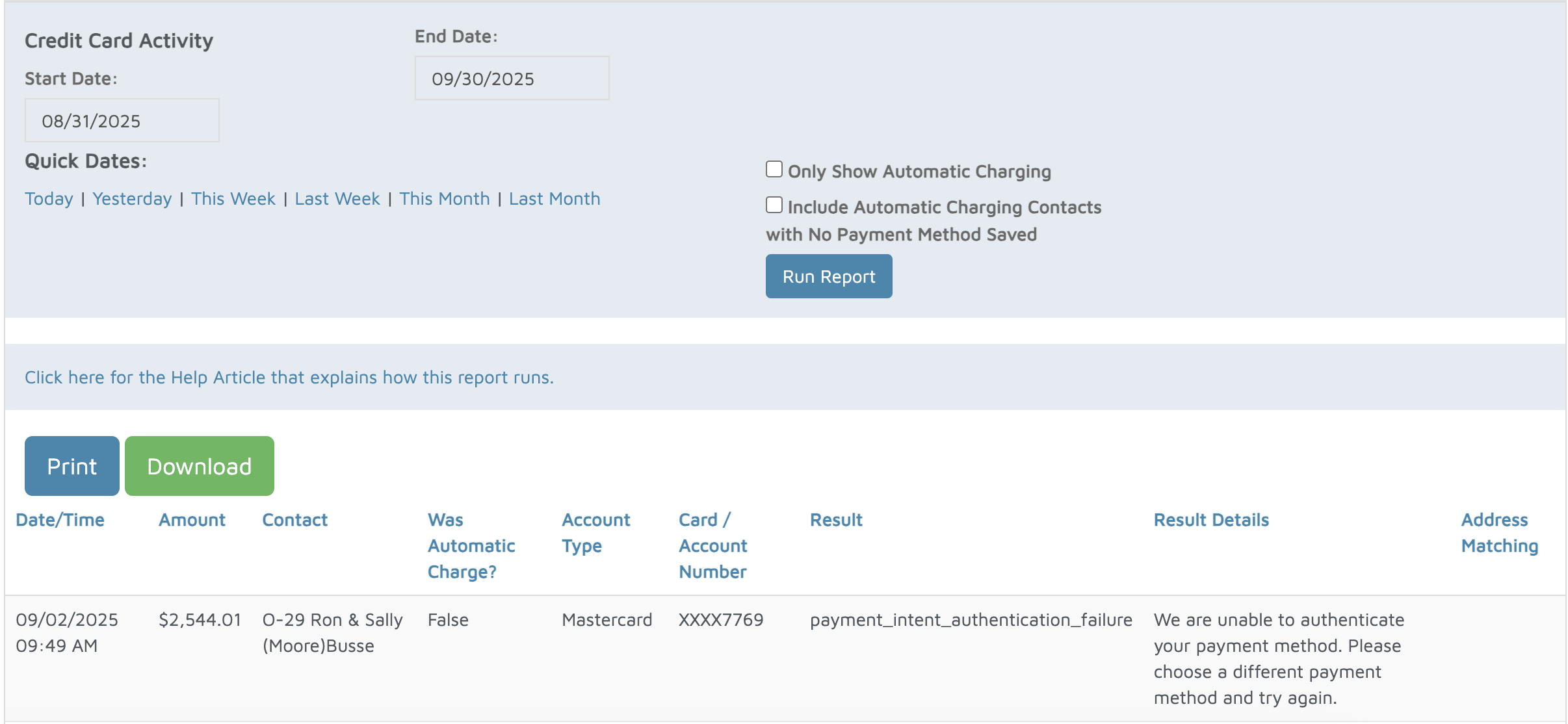 - Auto-Charge Status – indicates whether the charge was an automatic billing or manually processed.