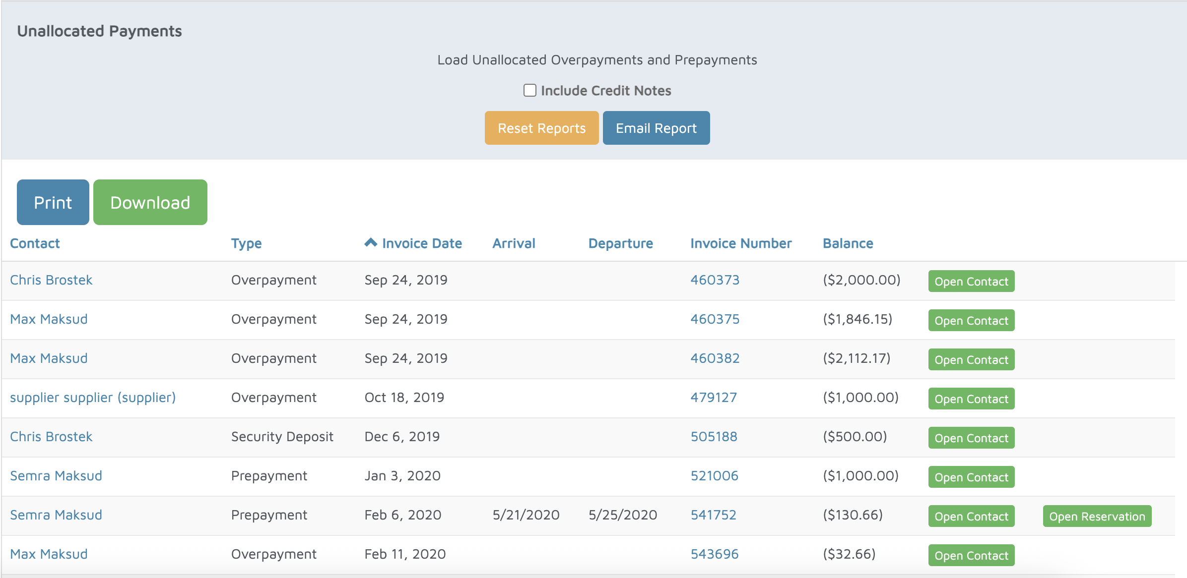 By default if you run the report without changing any settings, the system will list all prepayments (deposits), security deposits, overpayments, and payment on account invoices that still have a negative balance. In other words, they have not been fully allocated to pay off customer's balances.