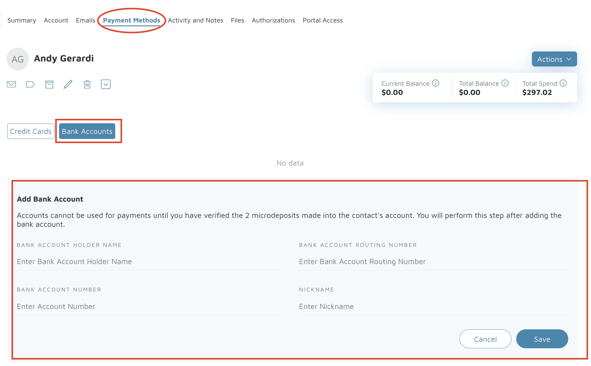 - Navigate to the contact’s profile and select Payment Methods → Bank Account.