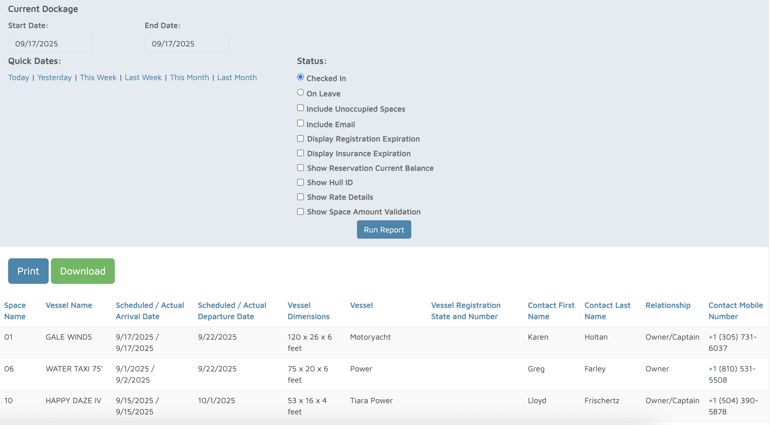 - "How can I generate a report showing which vessels are currently in which spaces, along with customer and vessel details?"
