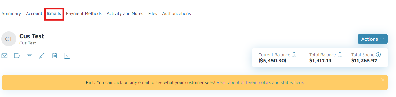- In the Contacts screen, navigate to the customer's Emails tab to find the e-mail.