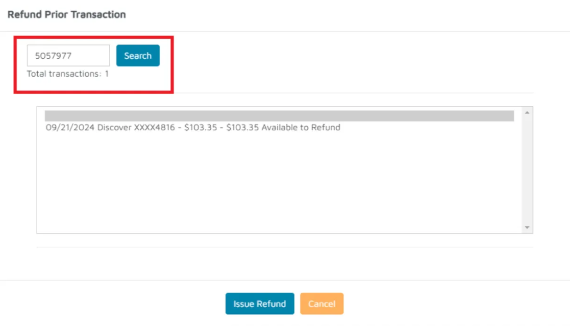 - Click Credit Card. The Refund Prior Transaction pop-up will appear.