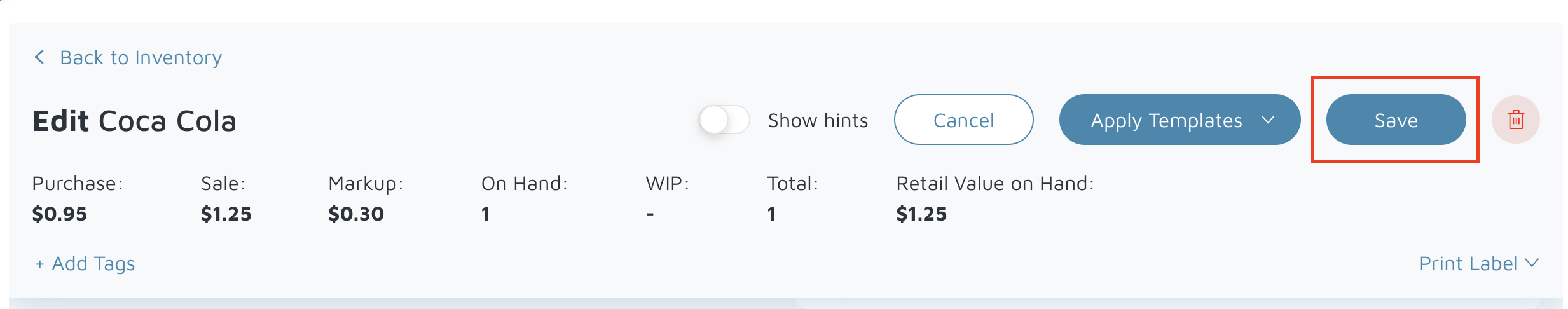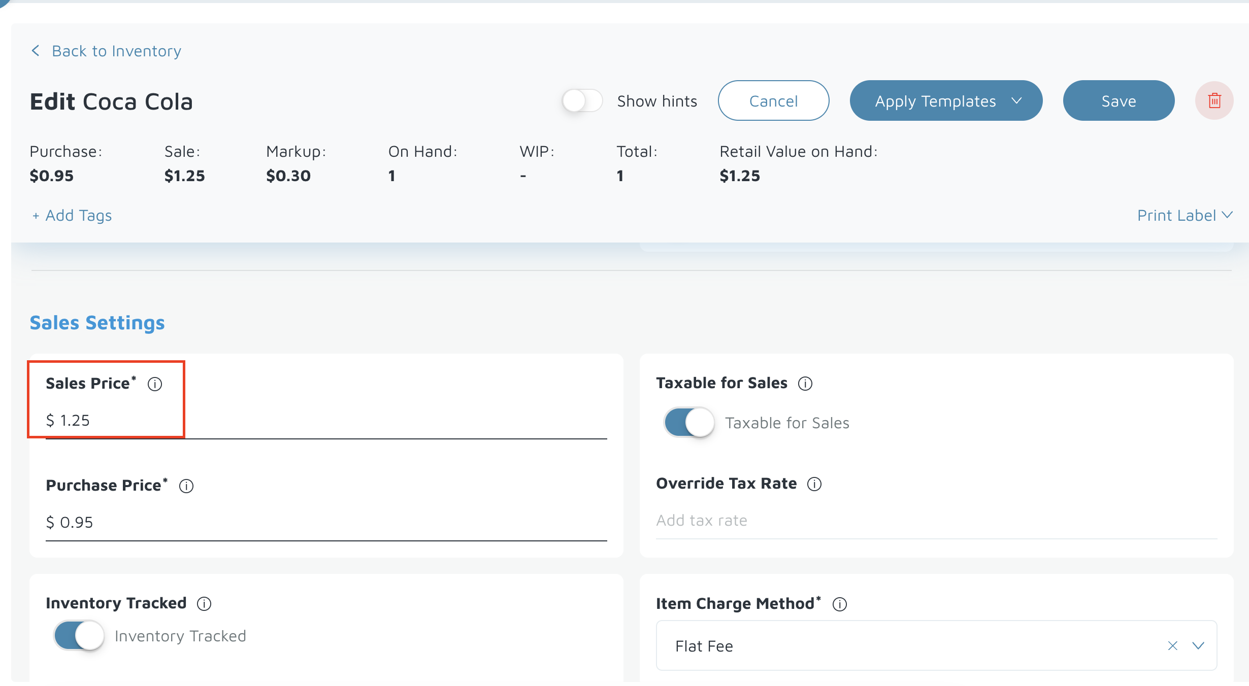 Verification: Re-open the inventory item to confirm the updated sales price is saved.