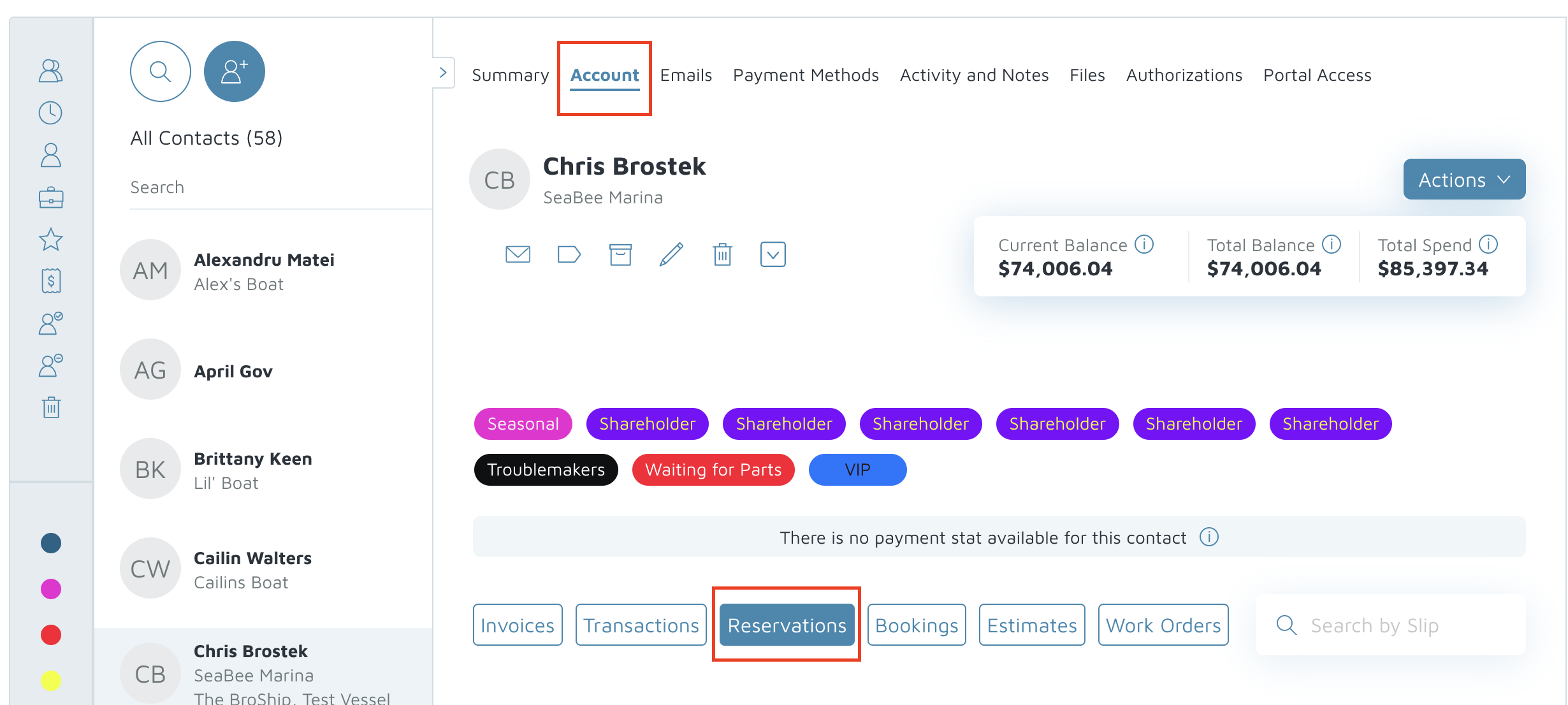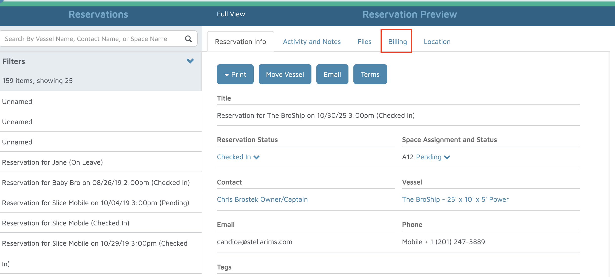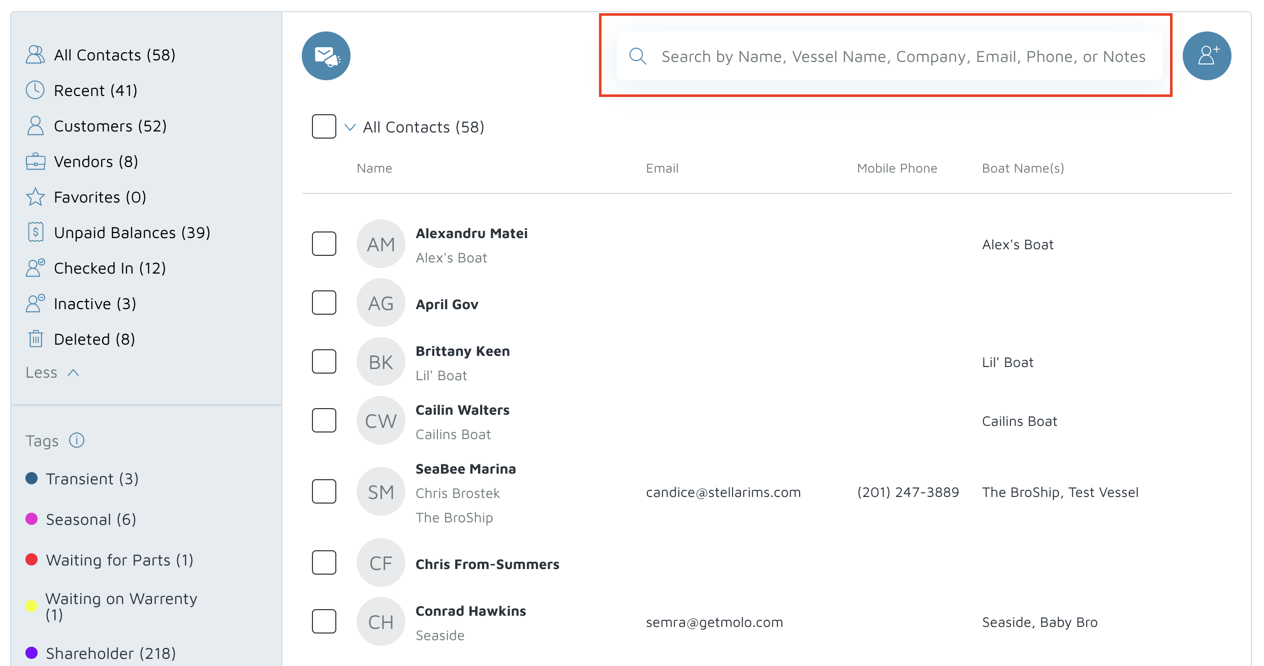 - Search for the contact by Name, Vessel Name, Company, Email, Phone, or Notes.