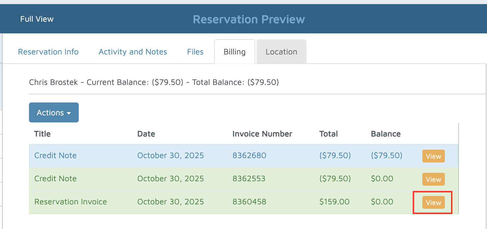 - Click View on the right-hand side of the reservation invoice to discount.