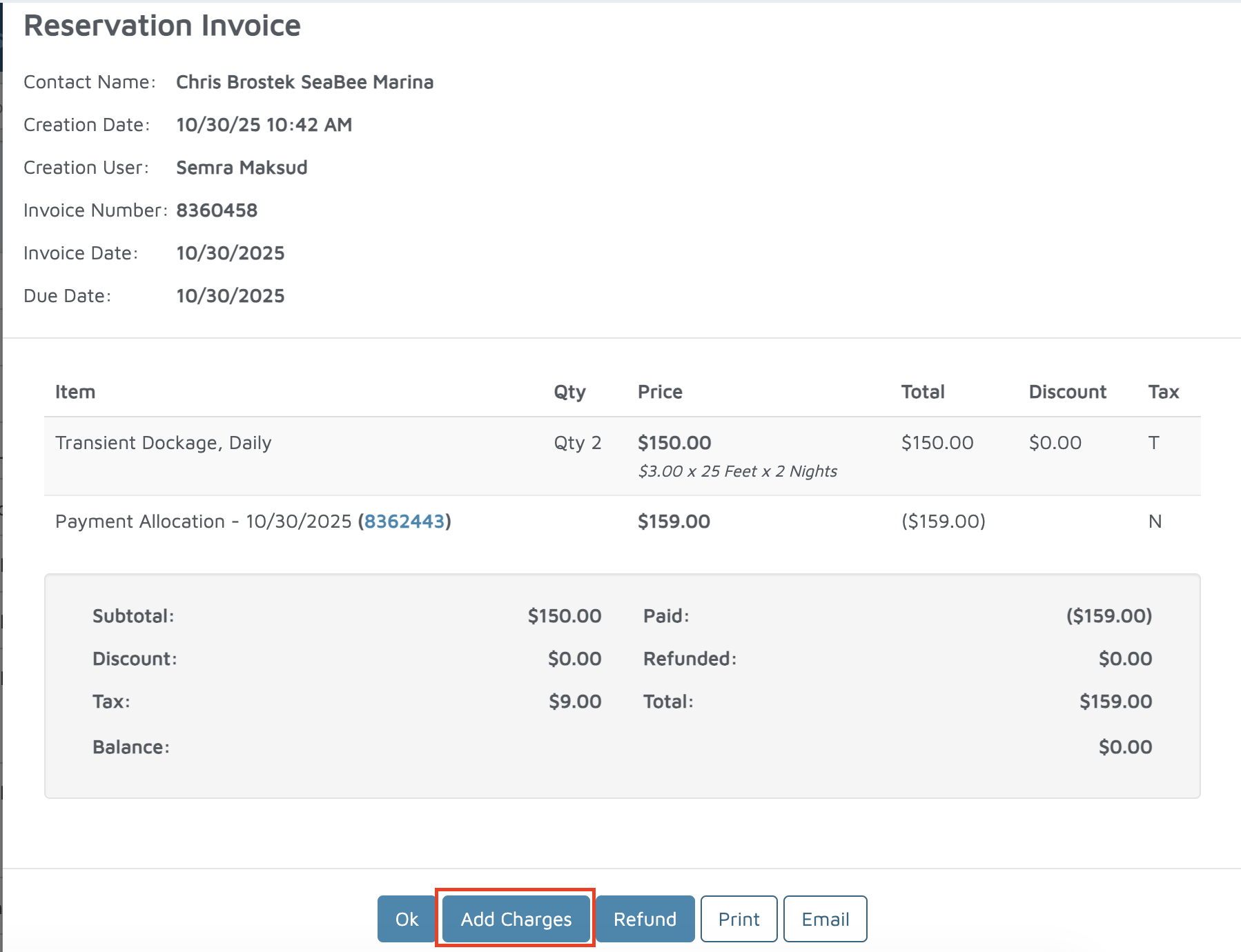 - Click Pay or Add Charges to open the reservation invoice on the POS screen.