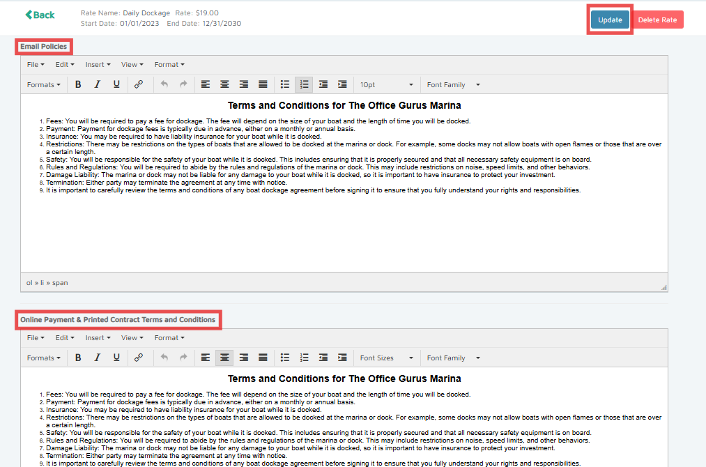- Click on an existing rate and scroll to the bottom to find the Email Policies section.