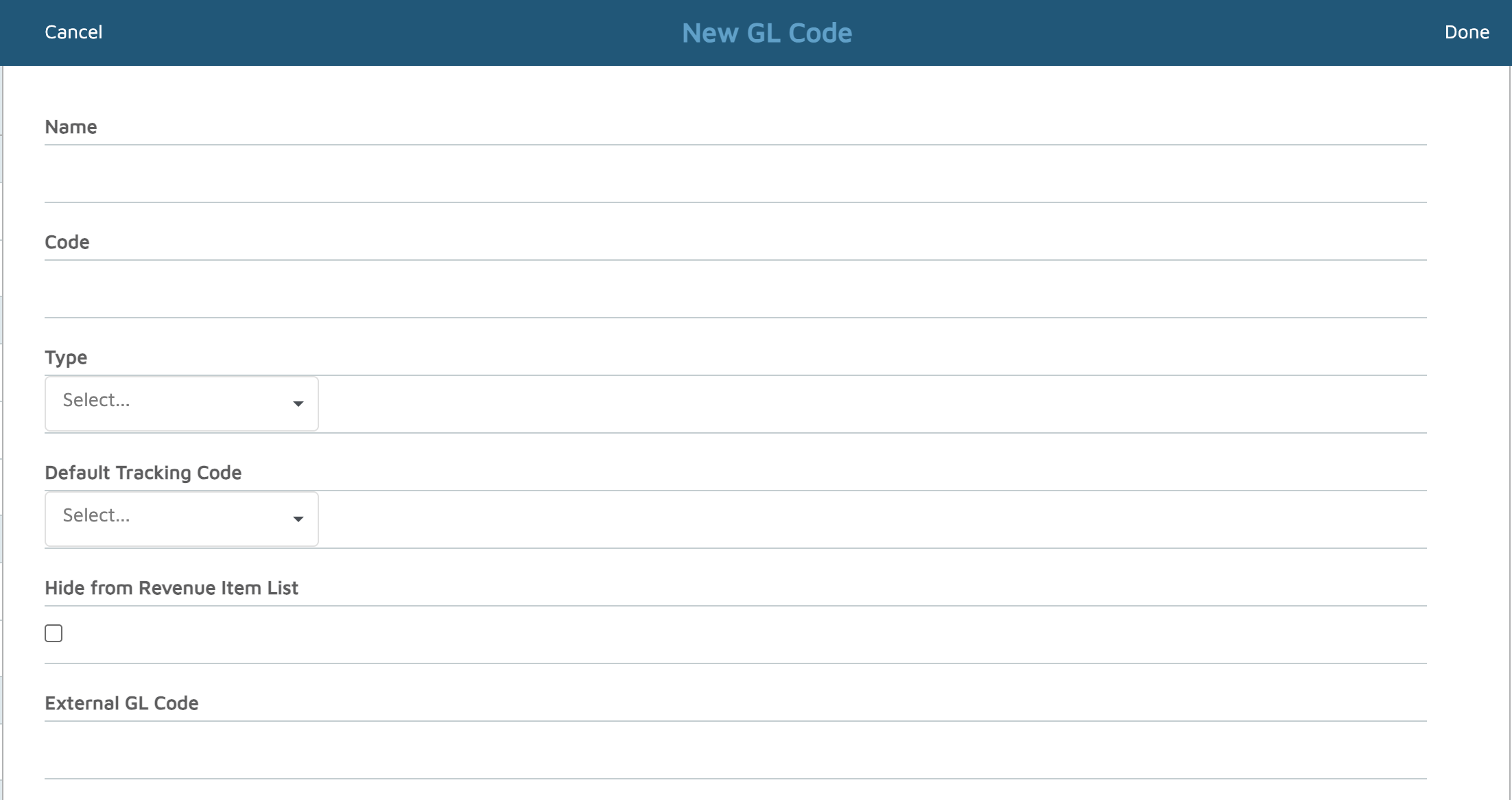 - In each field (e.g., Revenue, Deposits, Bank Accounts), enter or select the GL code that should be associated with that transaction type.