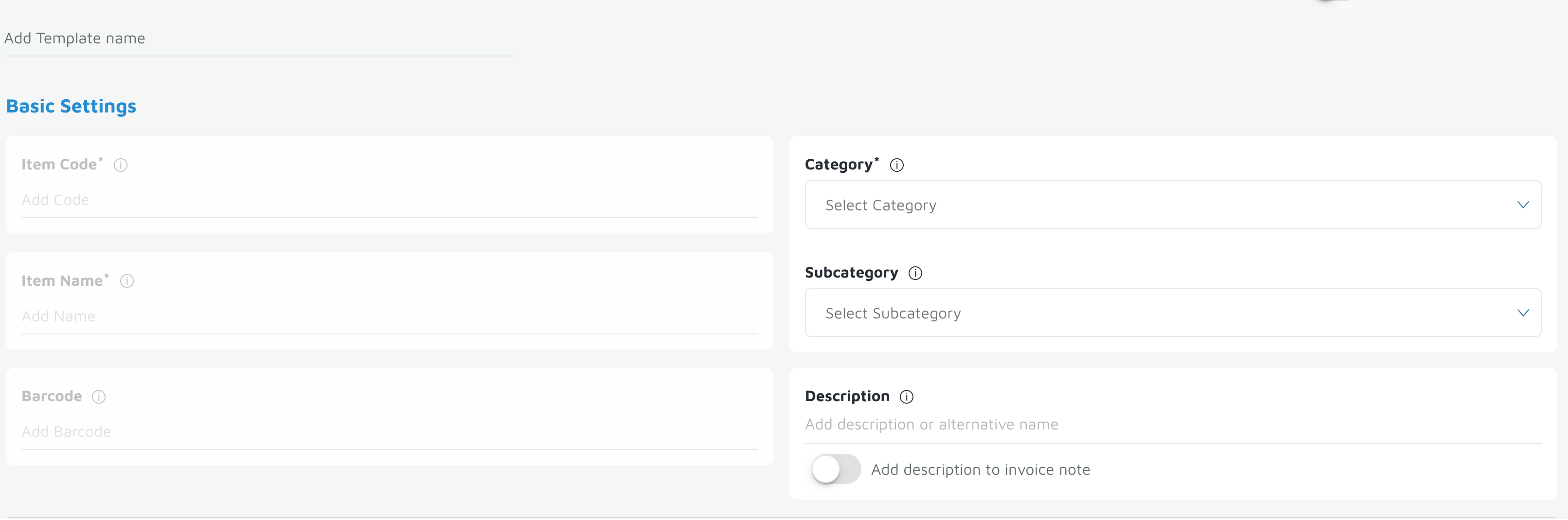 - Under Basic Settings, note that Item Code, Item Name, and Barcode will be grayed out — these will be unique per item.
