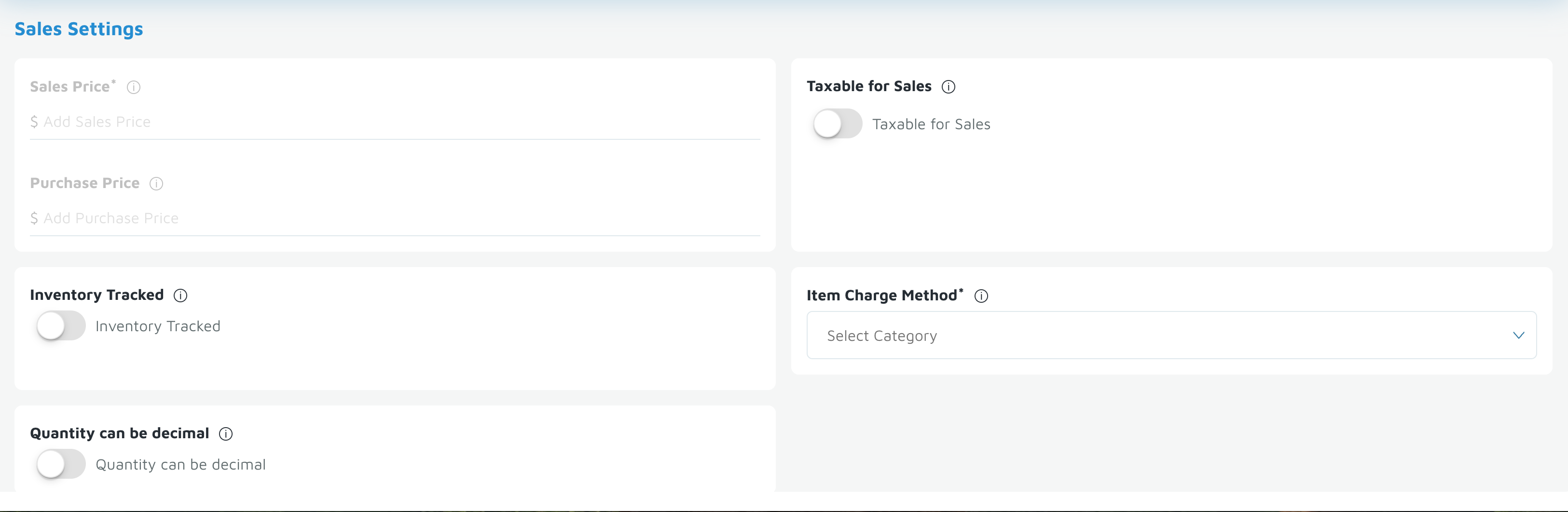 - Under Sales Settings, Sales Price and Purchase Price will also be grayed out since these may vary by item.
