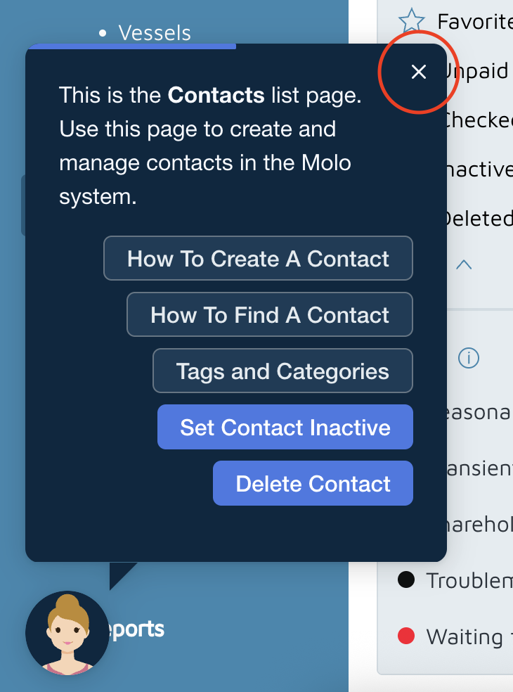 Verification: The help mode pop-up should come up when selecting Contacts & Vessels > Contacts.