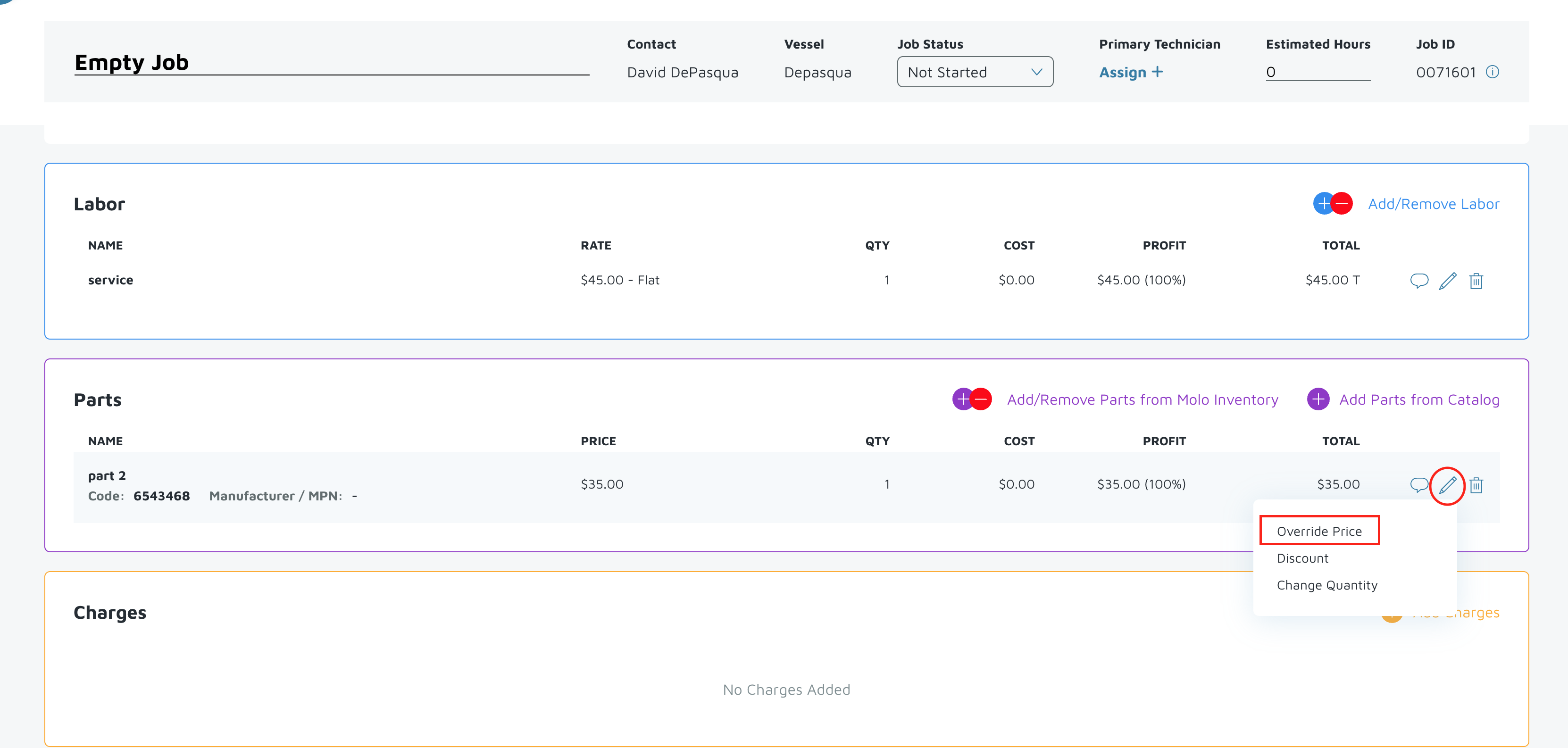 - Click on the job and click on the pencil to 'override' the price.