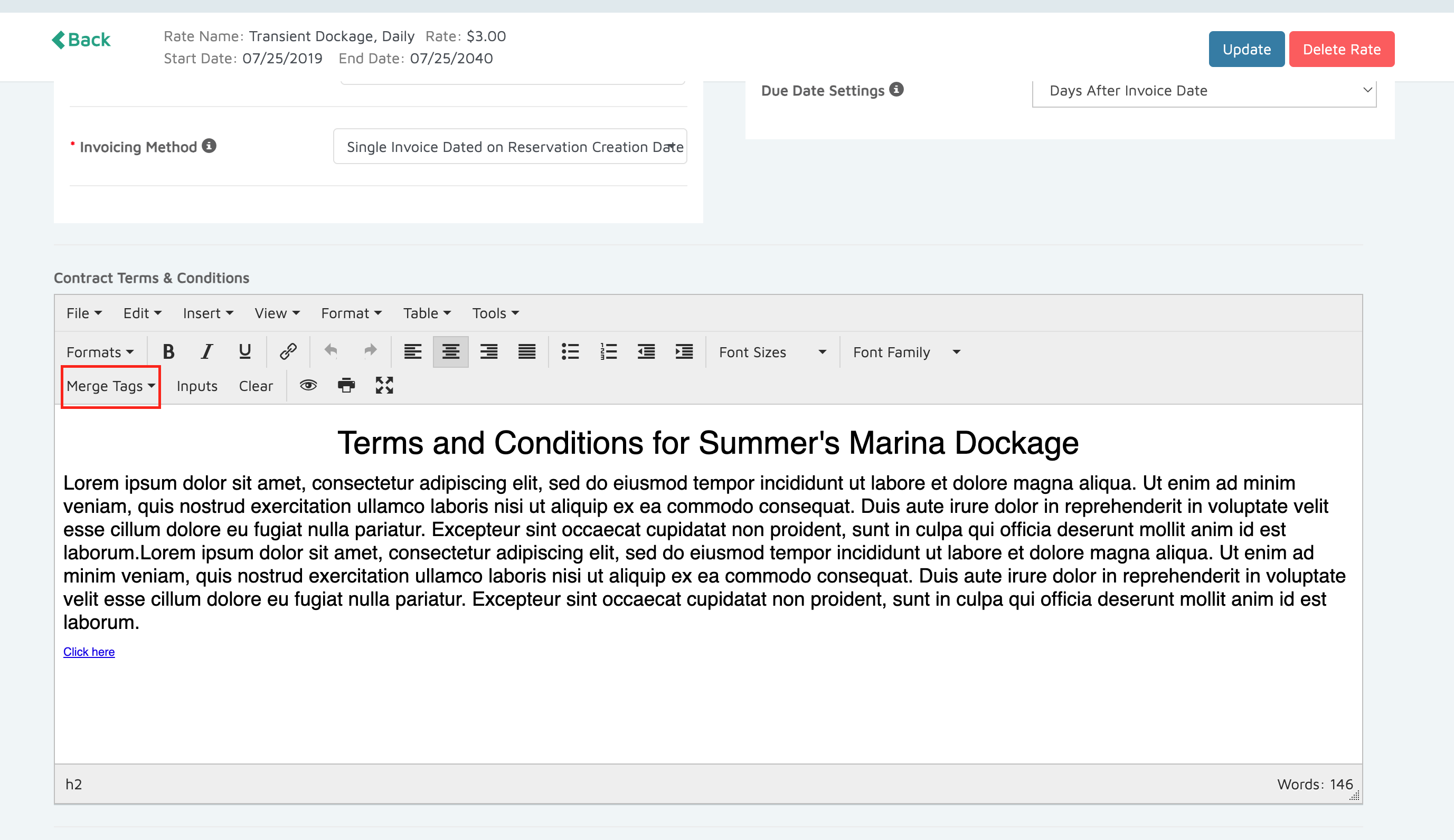 - Format your contract text around Merge Tags as needed. You may add punctuation, bold, or underline for clarity.
