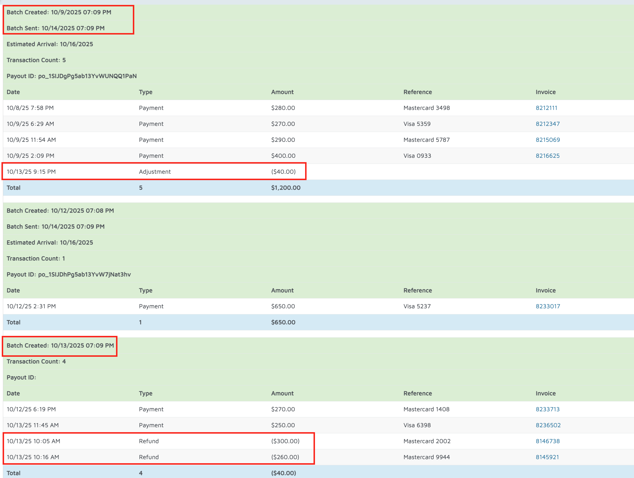 A refund was processed on the 13th, which fell inside the batch window. - Scroll to the batch created on the 13th to review the specific activity: