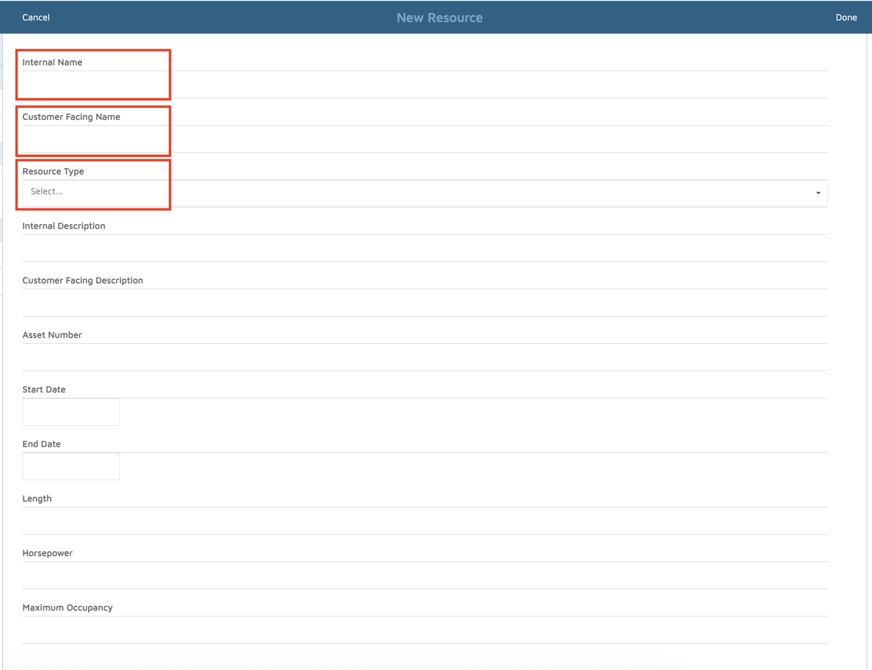 Fill in: Internal Name (e.g., Cabin 1), Customer-Facing Name, Resource Type (pick Cabin/RV), optional Description, optional Start/End Dates, optional Length.