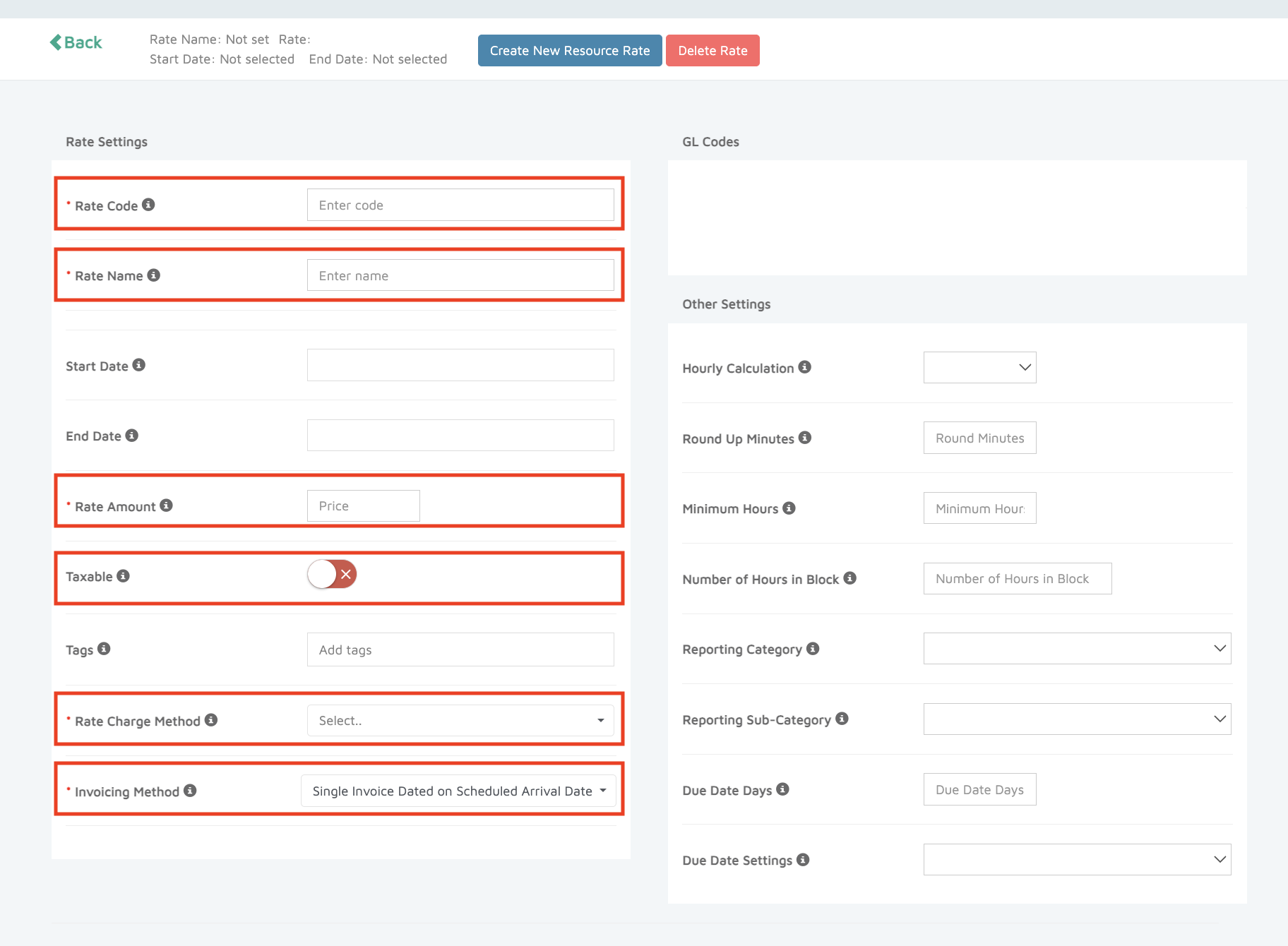 Enter Rate Code, Rate Name, Rate Amount, Taxable, Rate Charge Method, and Invoicing Method,(e.g., “Cabin Nightly”).