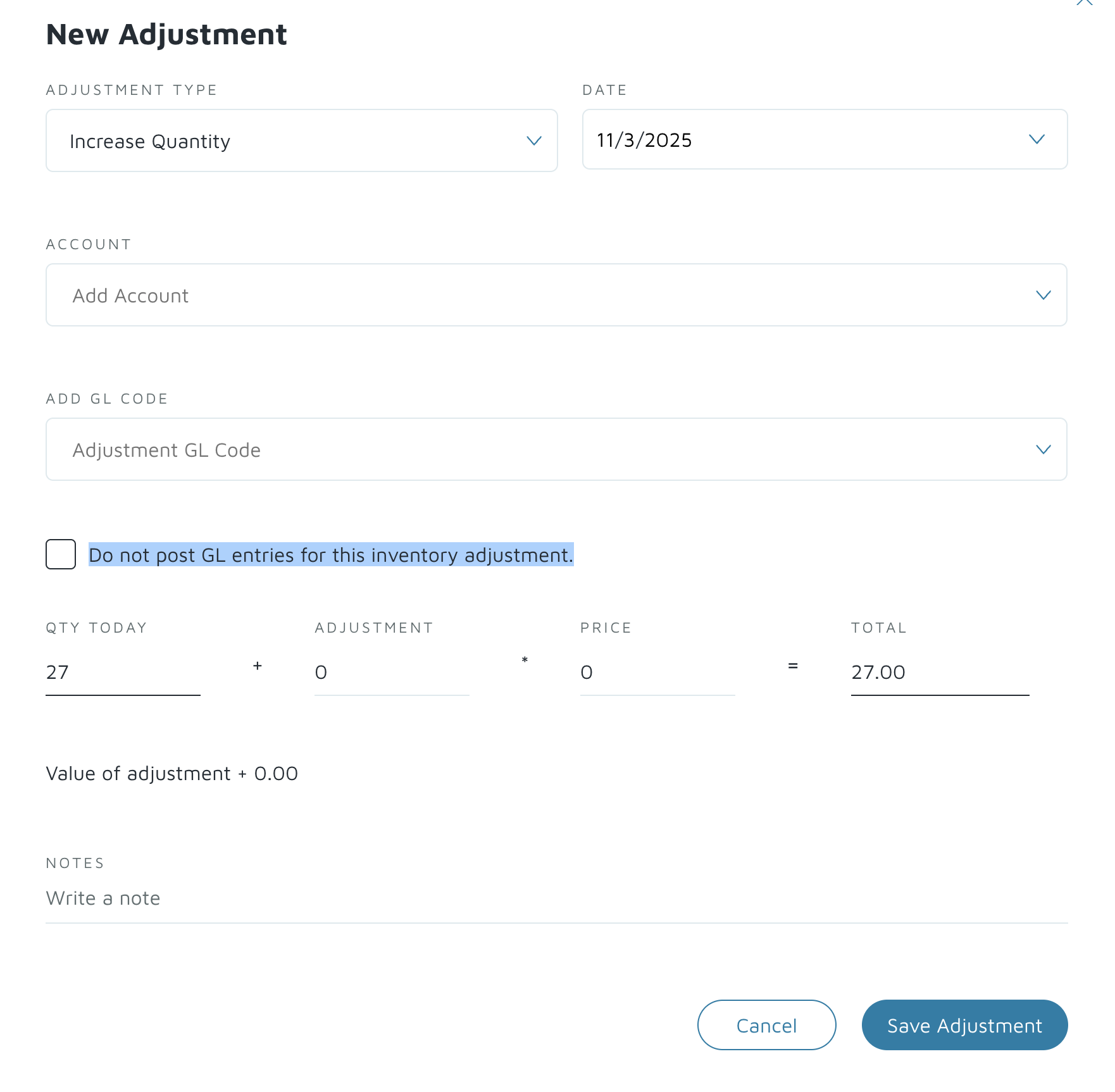 - If you want the adjustment to affect your General Ledger (GL) accounts, select the appropriate Adjustment GL Code from the dropdown list.