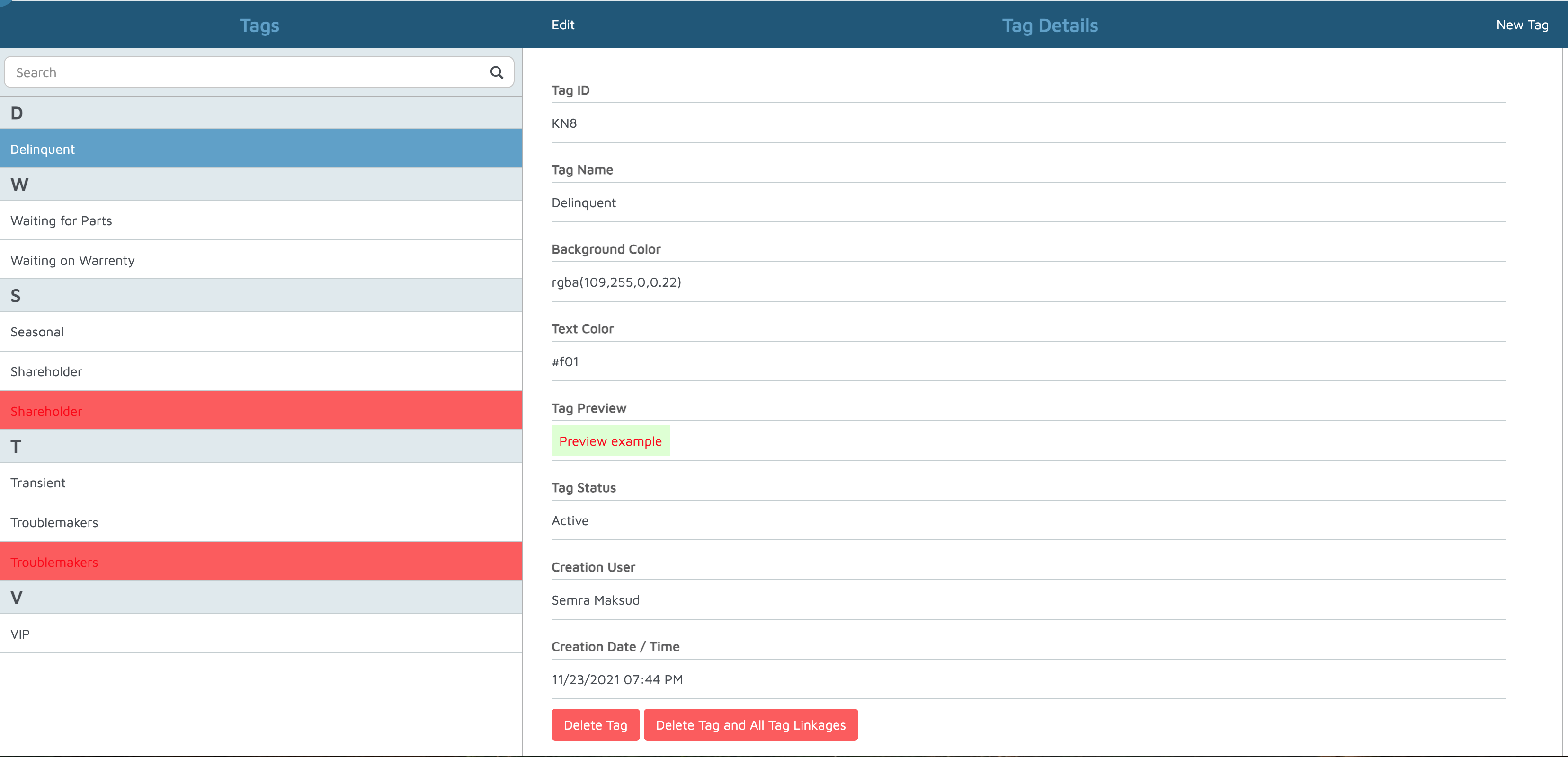 - Select Delete Tag in All Tag Linkages to remove it from any customers or records it is currently associated with.