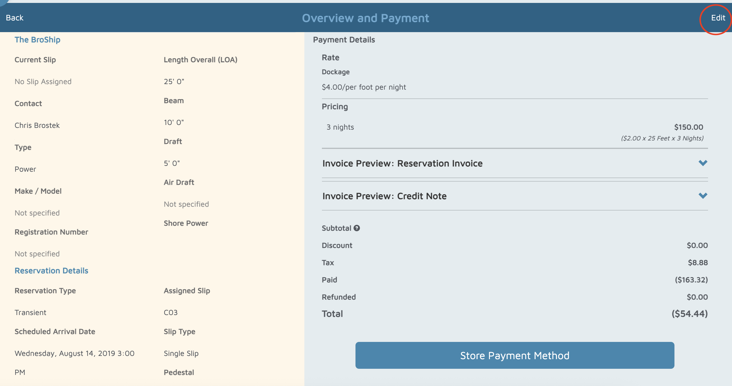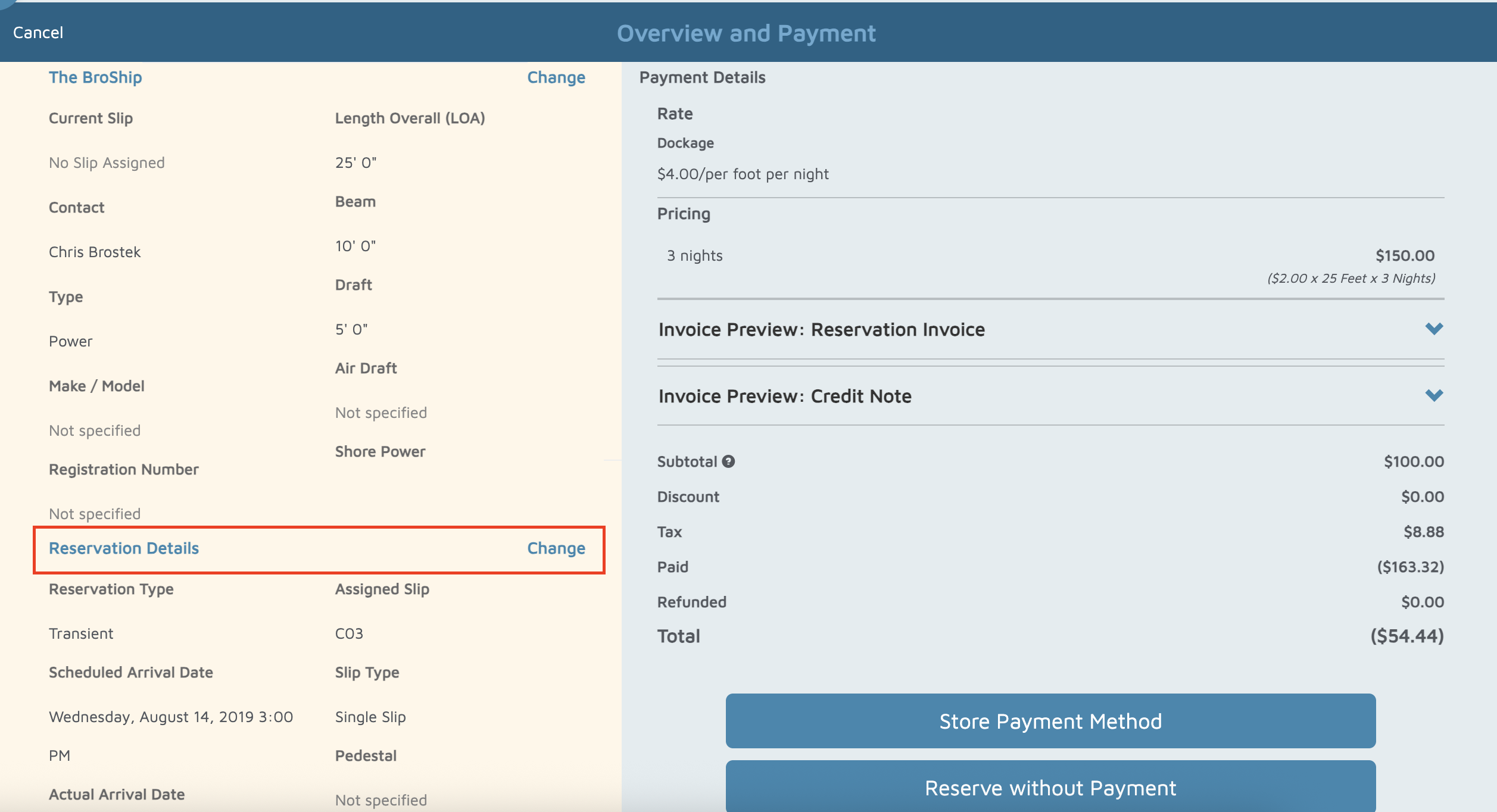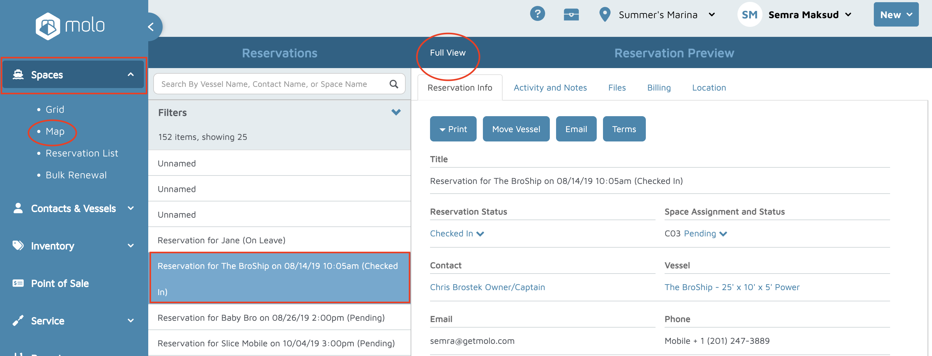 - Type the name of the contact or vessel in the search box to locate the reservation you want to modify.