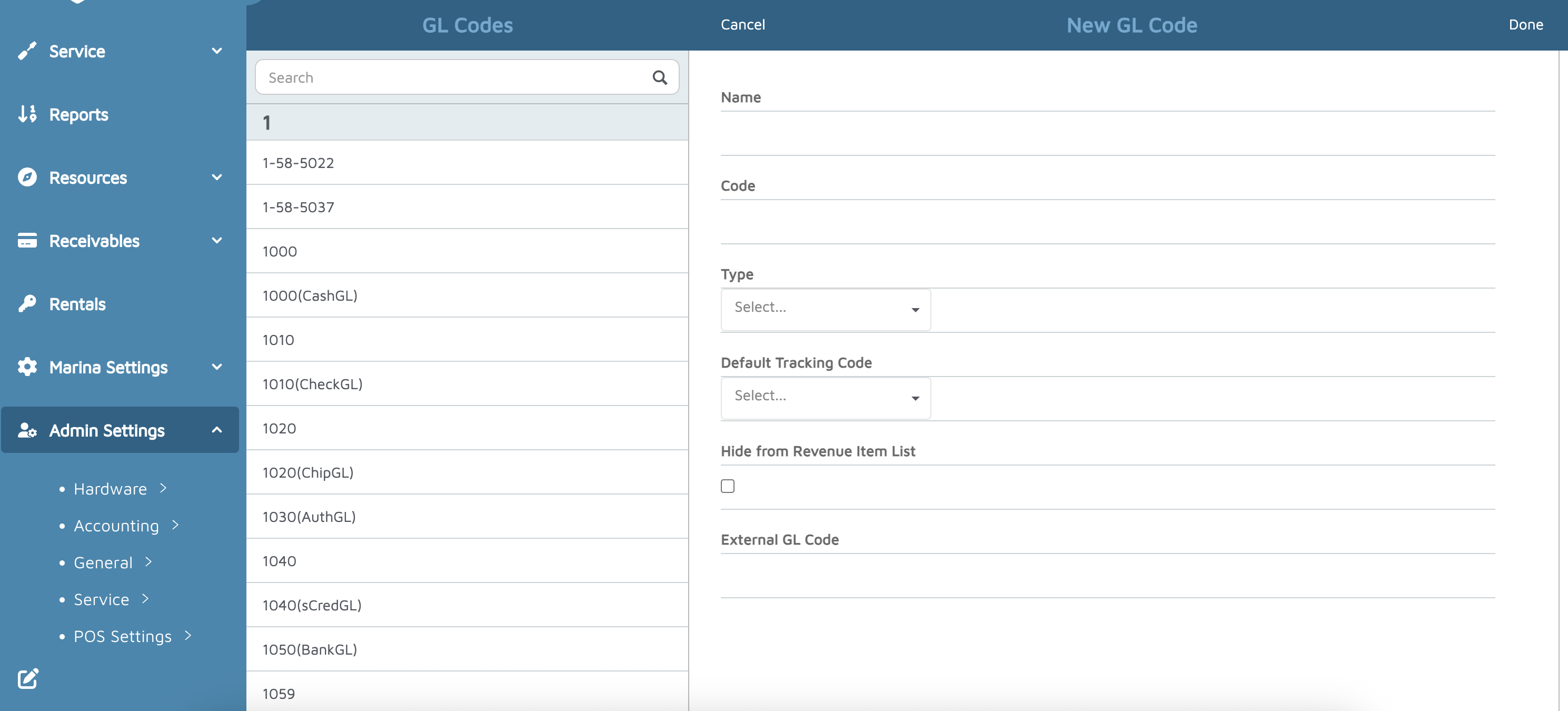 - Admin -> GL Settings - Some system-level GL codes will be set under the GL Settings section. These include codes for categories such as your AR, Payments, Discounts, and Taxes GL codes.