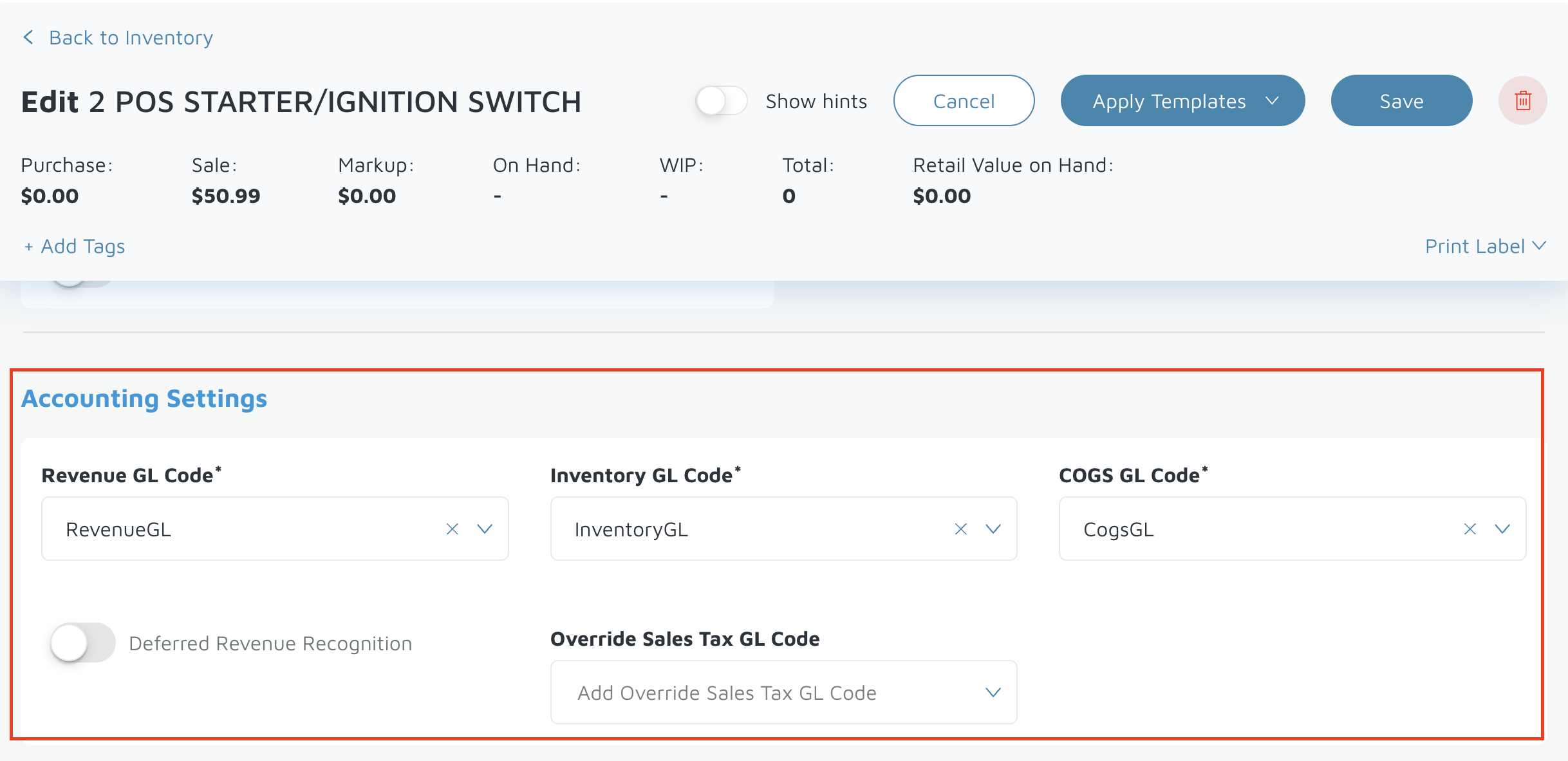 - Admin -> Inventory -> Items - You will go into each item and set its GL code under the Accounting Settings section.