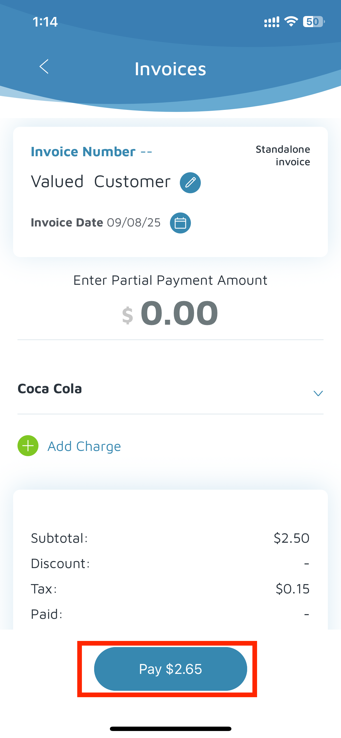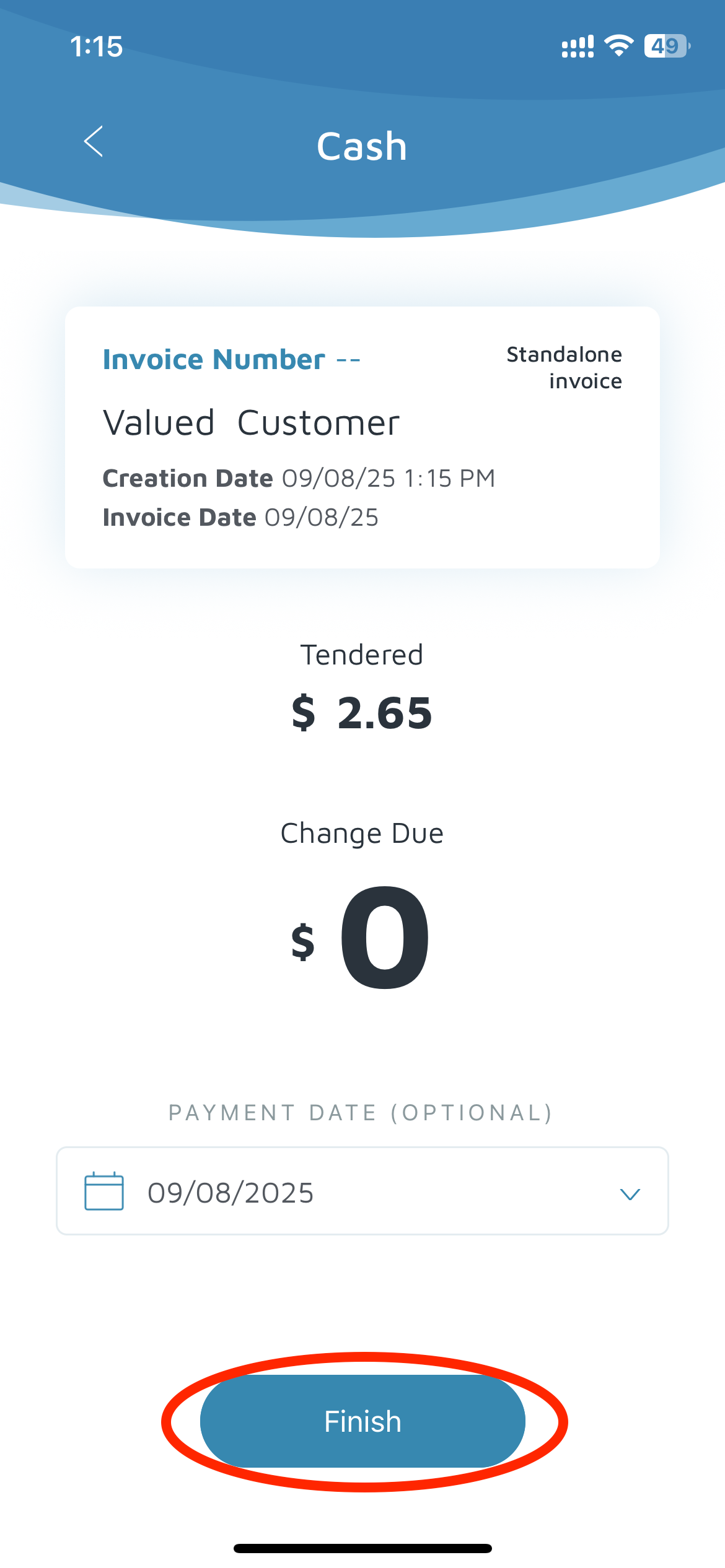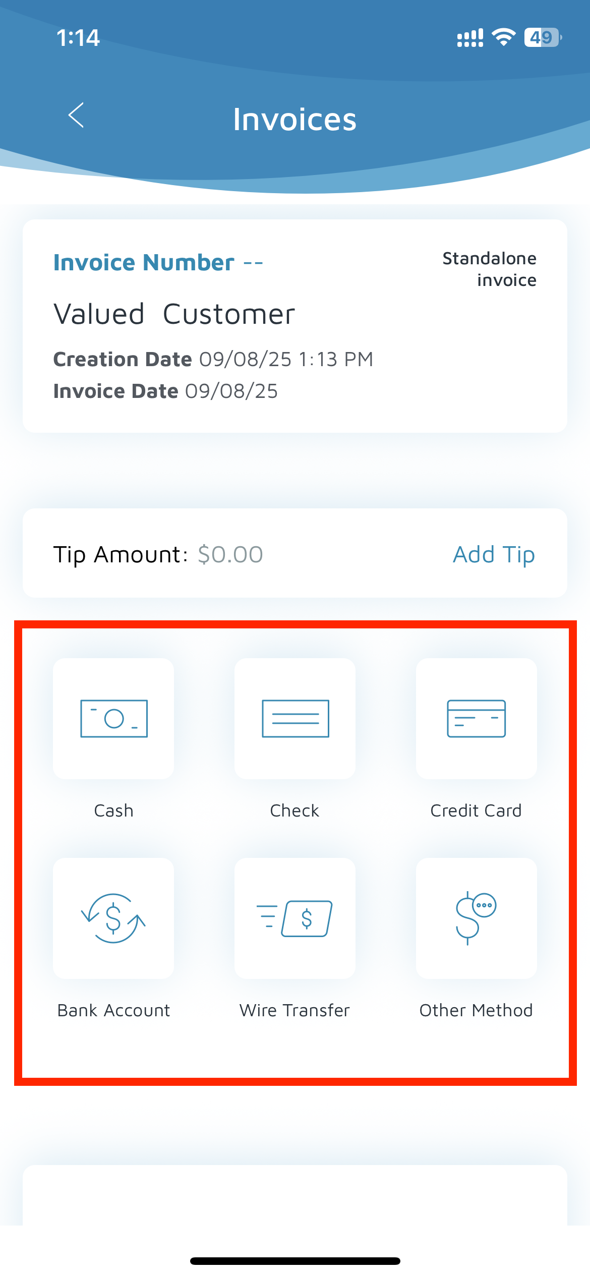 Choose a payment method (Cash, Check, Credit Card, Bank Account, Wire Transfer, or Other).