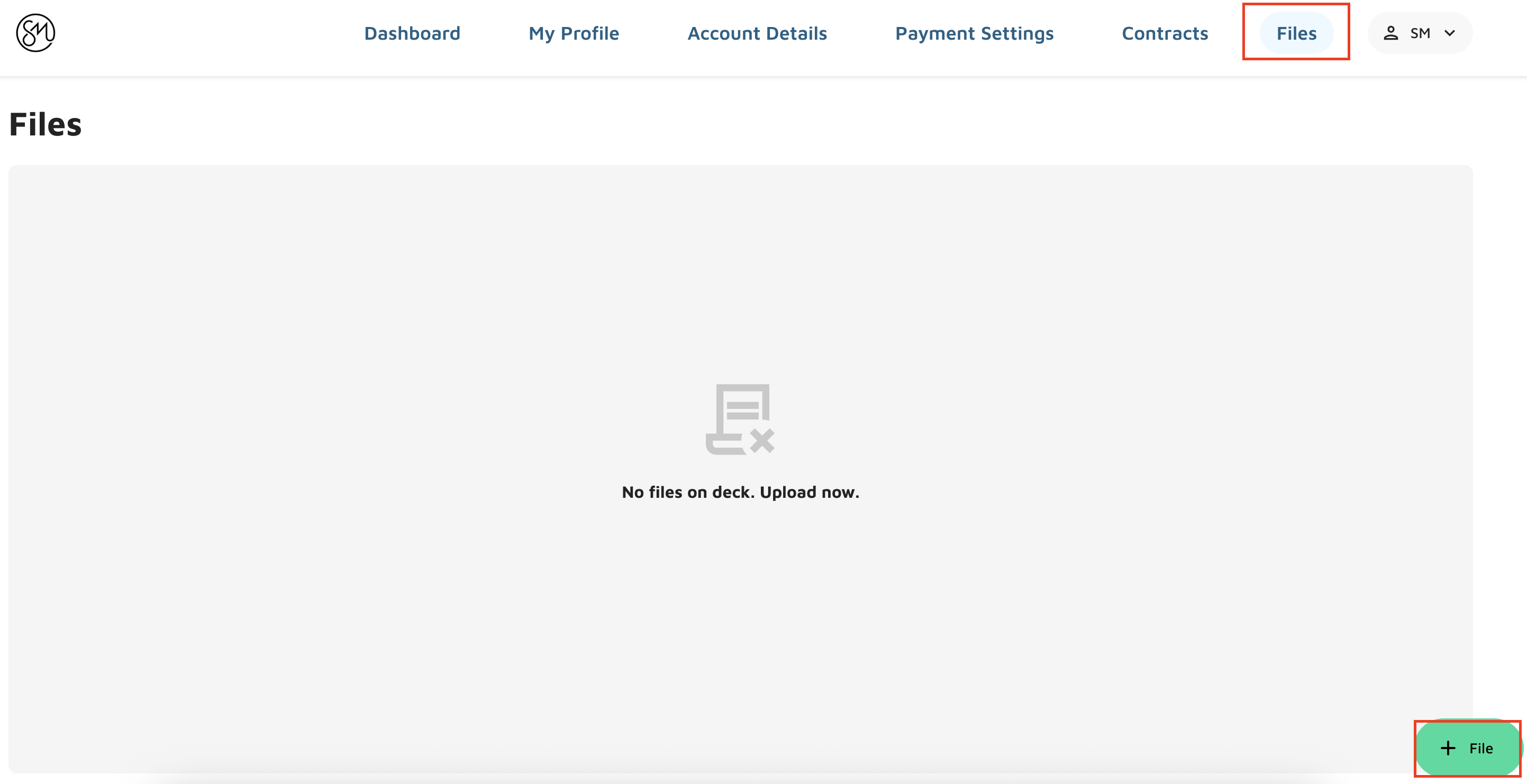 The Files section gives the ability to upload new documents and view documents that were previously uploaded in the portal. Files that were uploaded directly in Molo will not show in the Customer Portal.