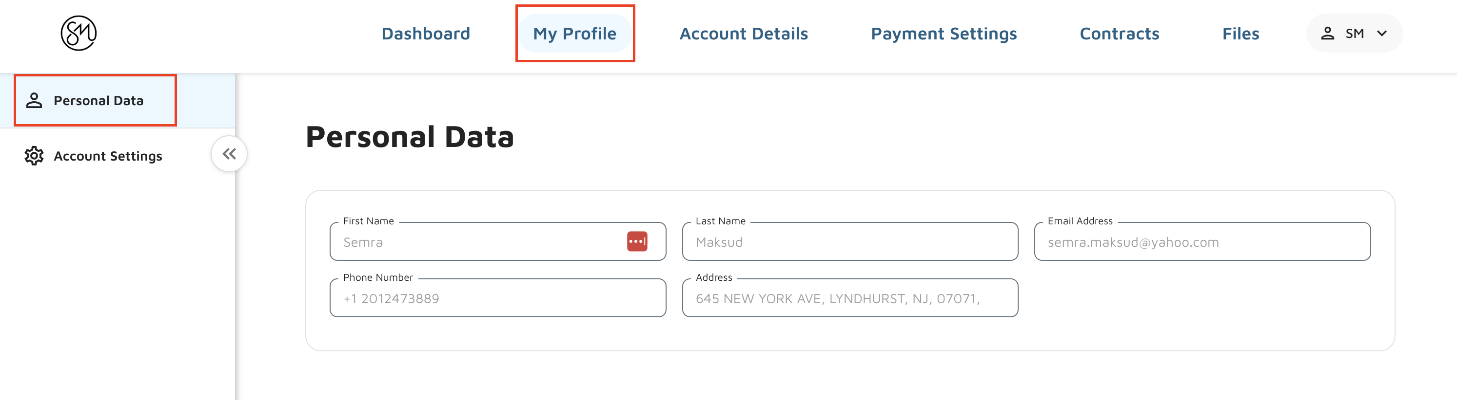 The My Profile section will display data that is set for the contact and is not able to be edited, Data will show in two sections: