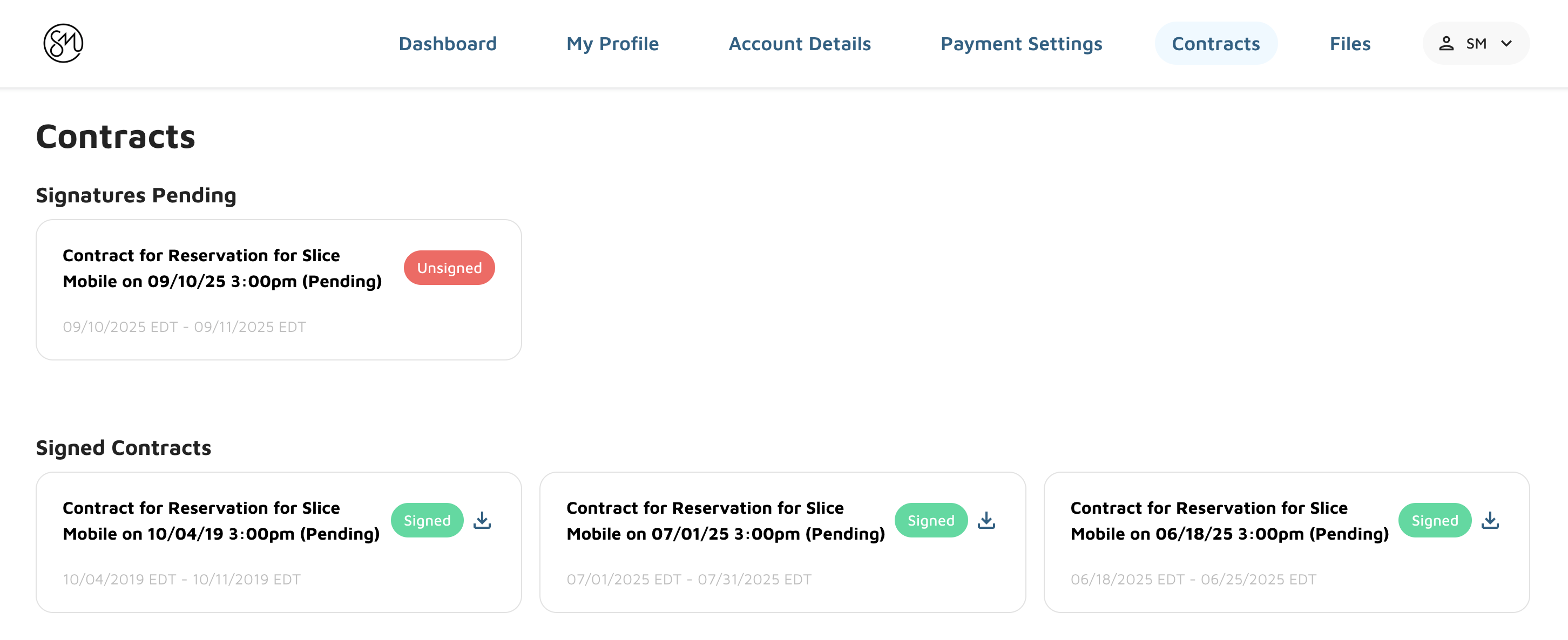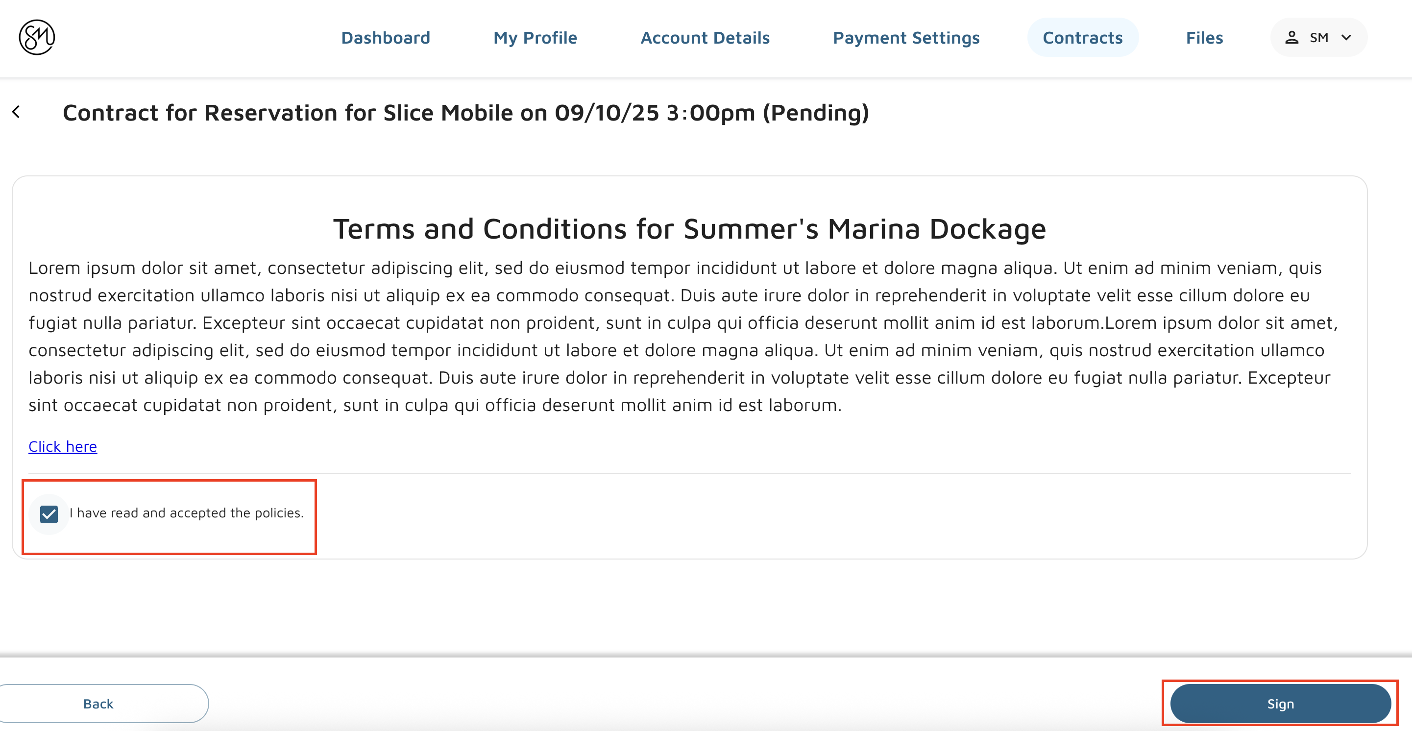 Reservations that are pending and have terms that are not accepted and/or marked as accepted offline will appear to be signed in the Customer Portal. Note: ‘Contract’ in the Customer Portal refers to a ‘Reservation’ in Molo.