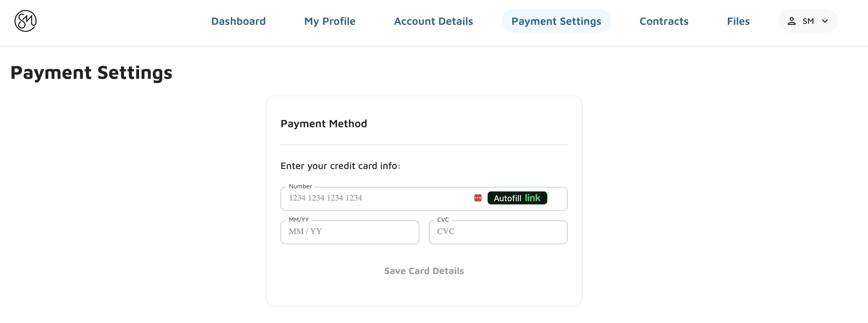 Adding a New Payment Method: To add a new payment method, the customer would open up the Payment Settings and select + Add Payment Method > New Card. From there, they would enter the Credit Card Number, Expiration Date & CVC and then select Save Payment Method.