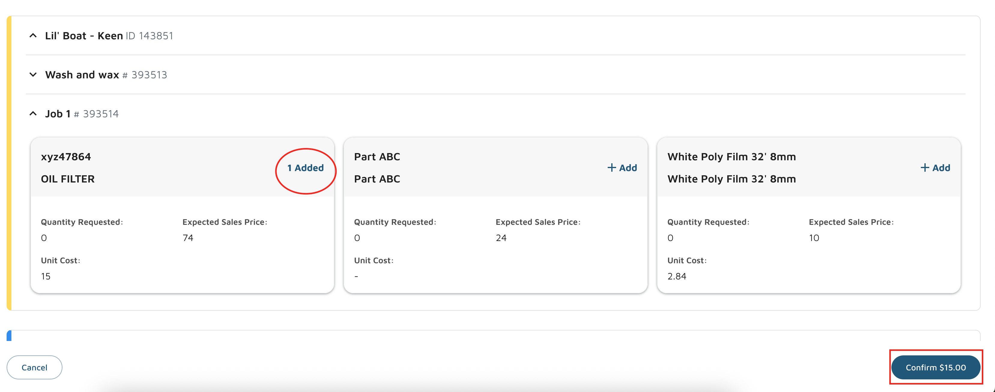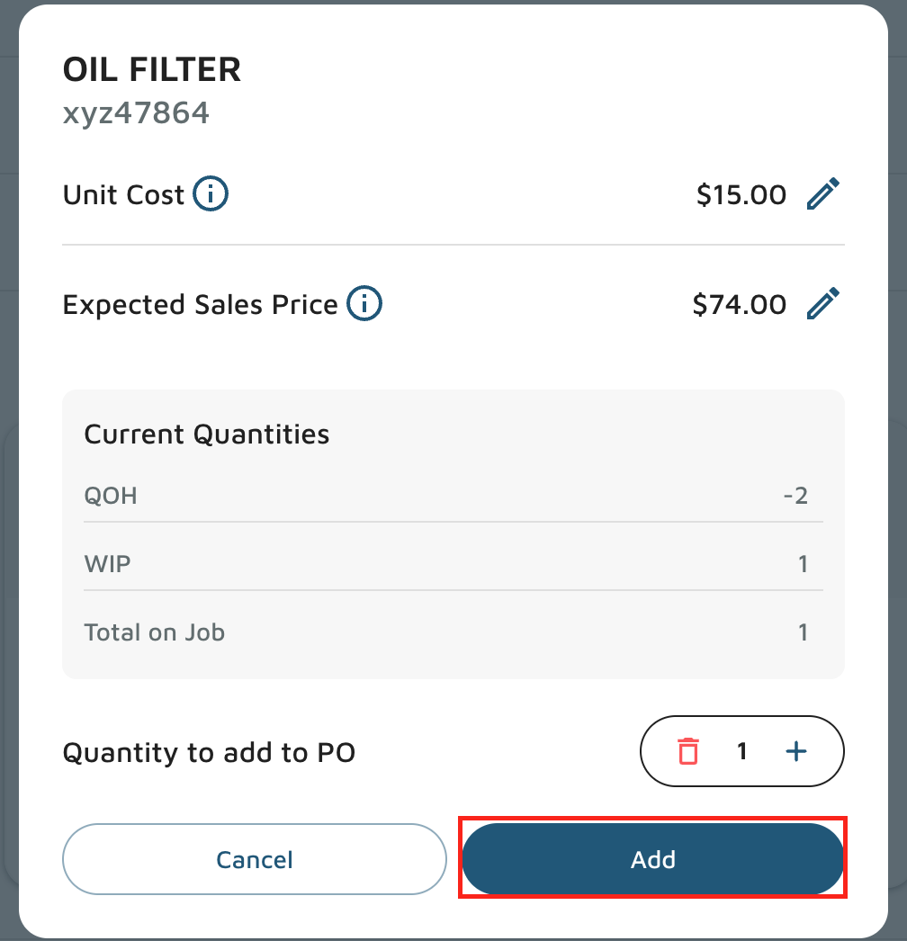 - Enter the quantity of the part you want to add and click Add.