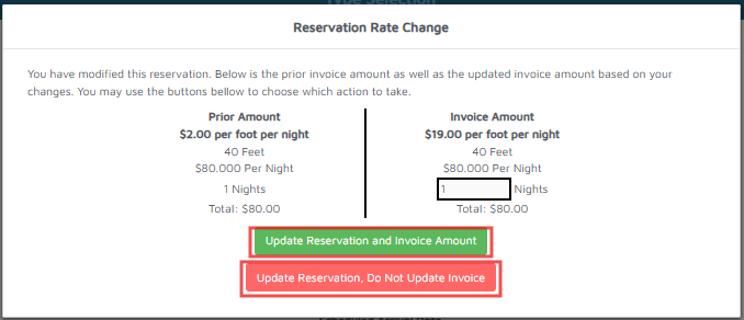 - On the popup, select either Update reservation and invoice amount or Update reservation, Do not update Invoice.